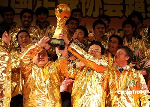 12月4日,2008中國足球協(xié)會超級聯(lián)賽頒獎典禮在山東濟南舉行。冠軍球隊山東魯能泰山全體將士登臺舉起火神杯。