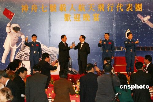 十二月五日晚,香港特區政府在香港會議展覽中心舉行晚宴,歡迎“神舟七號”載人航天飛行代表團一行。中新社發 武仲林 攝