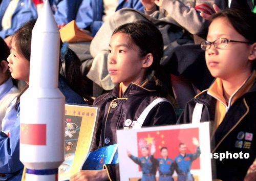 圖為中國載人航天工程辦公室主任及副團長王文寶及三位航天員與香港學生真情對話現場,臺下的學生認真仔細地聽航天員回答的問題。中新社發 張勤 攝