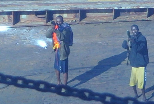 2艘小艇利用航速20多節(jié)的優(yōu)勢,已經(jīng)靠上了“振華4號”,左側(cè)船頭,荷槍實彈的海盜真的爬上了船。