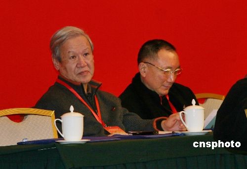 著名導演謝飛(左)、中影集團董事長韓三平在主席臺就坐。 中新社發 黃寧 攝