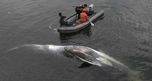 12月30日,菲律賓海岸警衛(wèi)隊(duì)在馬尼拉灣附近打撈起一具罕見的小須鯨尸體。這只重約2噸長(zhǎng)約10米的小須鯨的死因可能是與大型渡船相撞或者因?yàn)檠罅鞯淖兓月,這是馬尼拉灣附近首次浮現(xiàn)鯨魚尸體。