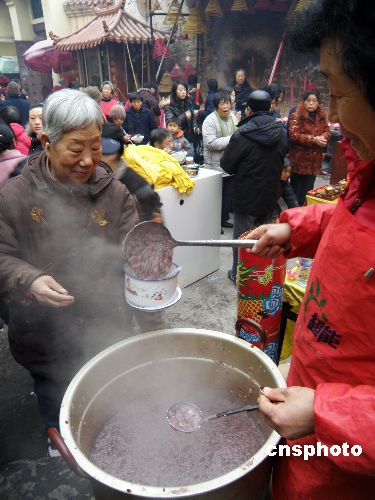 2009年1月3日,農(nóng)歷臘月初八,是中國傳統(tǒng)的臘八節(jié),湖北宜昌三峽古佛寺里準(zhǔn)備了豐盛的臘八粥,眾多名市民在古佛寺里喜吃臘八粥。據(jù)悉,臘八粥又稱佛粥,與佛祖釋迦牟尼得道成佛有關(guān)。臘八粥在民間被視為吉祥食品,寓意一年之末的大豐收及來年風(fēng)調(diào)雨順,吉祥如意。中新社發(fā) 劉君鳳 攝