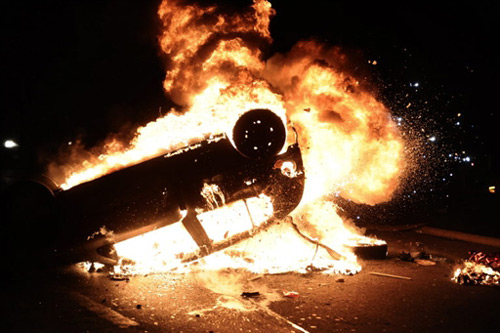 1月3日,在法國首都巴黎,一輛汽車在抗議以色列對加沙發動襲擊的示威集會中被點燃。