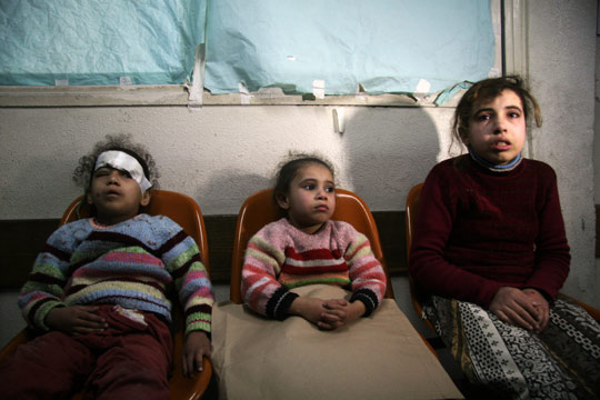 在以色列攻襲加沙中受傷的巴勒斯坦女孩在醫(yī)院外等候。6日,以色列部隊攻擊了聯(lián)合國在加沙地區(qū)設立的學校,造成數(shù)十人死亡。