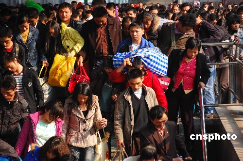 2009年1月10日,重慶北火車站迎來第一波春運(yùn)客流高峰。由于外出務(wù)工人員提前返鄉(xiāng),各大高校開始放假,民工流和學(xué)生流融合,重慶火車站在春運(yùn)前夕迎來了首個(gè)客流高峰,重慶市各大汽車站、火車站當(dāng)日都增開了加班車和臨客。2009年全國(guó)春運(yùn)從1月11日開始,到2月19日結(jié)束,共計(jì)40天。中新社發(fā) 許康平 攝