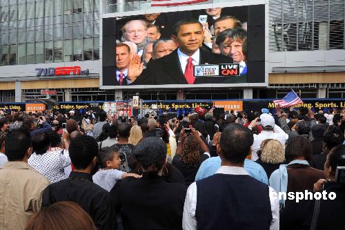 洛杉磯市民觀看奧巴馬就職。中新社發 張煒 攝