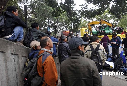 圖為死者的工友在車禍現場關注事件。中新社發 鄧慶樂 攝