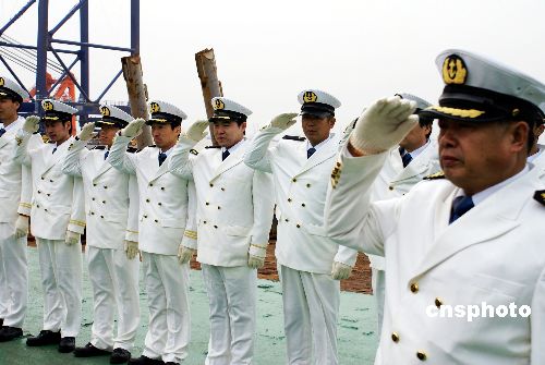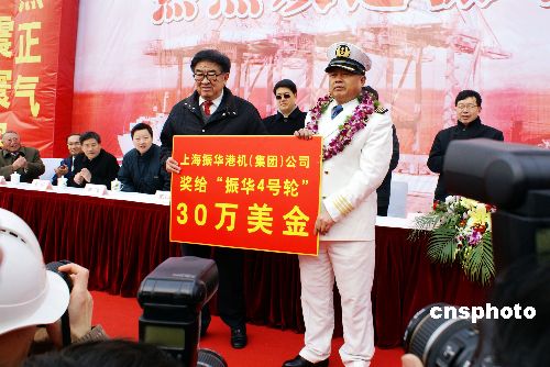 1月23日上午,上海振華港機集團在長興島基地為“振華4號”輪順利返航舉行盛大歡迎儀式,“振華4號”船長彭維源帶領29名船員整裝首次集體亮相,并向眾媒體記者和現場來賓介紹了抗擊索馬里海盜的具體經過。歡迎儀式現場,振華港機集團向每位船員頒發1萬美元獎金,并授予船長“振華功臣金質獎章”。北京時間2008年12月17日中午,中國交通建設集團所屬“振華4號”輪在途徑亞丁灣水域時遭遇2艘海盜船襲擊,有9名海盜登船,持沖鋒槍和火箭筒在甲板上與我船員對峙,我船上的30名船員用高壓水槍和自制燃燒彈自衛并反擊。海盜在隨后趕來的國際救援軍艦直升機的威懾下,終于放棄攻擊,狼狽逃竄。中新社發 李根 攝