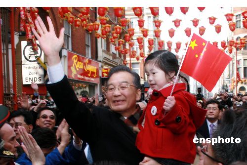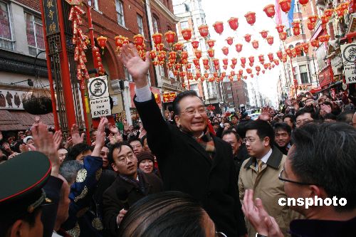 當地時間31日下午,中國總理溫家寶抵達倫敦后從機場直接前往唐人街,向華人華僑拜年。