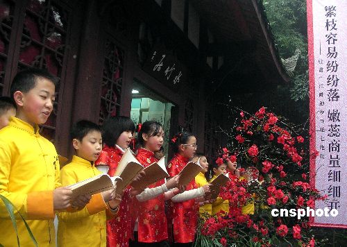 圖為來自成都草堂小學的百名小詩童齊誦杜甫與高適唱和的詩作,一表心中敬意。中新社發 楊杰 攝
