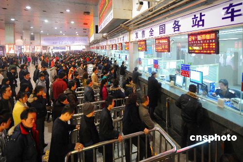 2009年2月1日消息,成都車站今年春運在原有67個售票窗口的基礎上新增臨時窗口50個,新開設客票代售點143個,有效分流車站售票壓力。今年成都車站節后春運“買票難”得到明顯緩解。中新社發 曹寧 攝