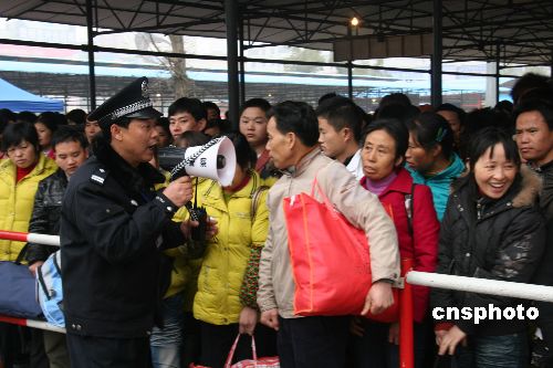 湖南衡陽火車站是湘南地區(qū)節(jié)后旅客最大的集散地,2009年1月31日以來,日發(fā)送旅客5.5萬余人次,創(chuàng)歷史新高。連日來,衡陽鐵路公安處全警出動(dòng),分布在衡陽火車站安檢口、售票廳、站臺(tái)等崗位,組織旅客有序進(jìn)站,確保廣大旅客群眾出行安全。中新社發(fā) 劉愛成 攝
