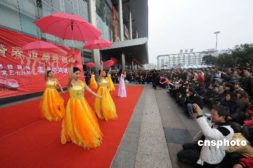 2009年2月3日,成都鐵路局文藝演出小分隊來到成都火車站進行慰問演出,為等候乘車的旅客們表演了歌舞、獨唱、川劇變臉等節(jié)目,祝大家愉快出行、一路順風(fēng)。中新社發(fā) 曹寧 攝