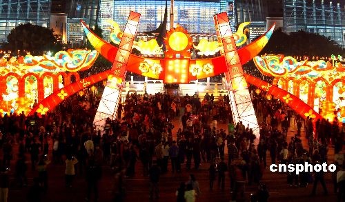 二月五日晚,為期五天的第三屆福州南后街元宵燈會在五一廣場、南后街同時正式亮燈,數百盞花燈呈現出濃濃的節日氣氛。圖為福州南后街元宵燈會五一廣場花燈展區,一座50米長的大型門燈以及門燈后的“萬象更新”平安廊前人潮涌動,數萬市民絡繹不絕的到此觀賞獨具福州民俗特色的花燈。中新社發 劉可耕 攝