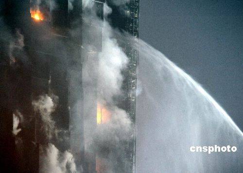 北京央視新樓配樓起火,消防部門用高壓水槍控制火勢。中新社發 廖攀 攝