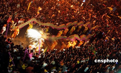2月9日晚,僑鄉泉州市民舉家出游賞花燈、看踩街熱鬧非凡。圖為踩街里的火龍隊伍在民眾中穿梭。中新社發 傅丹丹 攝