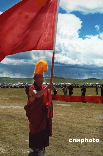 藏族同胞高舉五星紅旗。中新社發(fā) 扎西朗杰 攝
