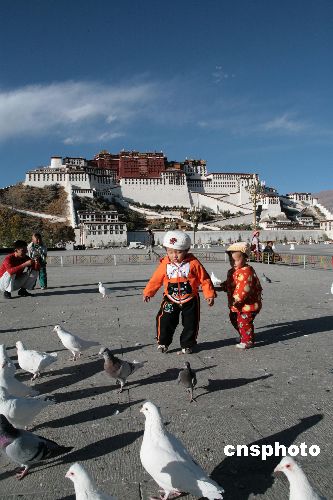 布達拉宮廣場上的孩童與鴿子。中新社發 扎西朗杰 攝