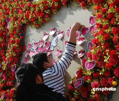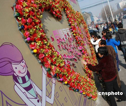山東濱州街頭佇立起一長達10米、寬4米的巨大“情人許愿墻”,供來來往往的行人抒寫對愛人、情侶、朋友的心靈物語與美好祝愿。中新社發 梁寶海 攝