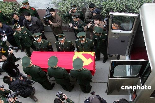 圖為張建勇烈士的靈柩被抬上靈車。中新社發 富田 攝