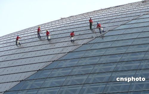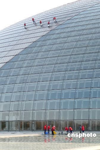 2009年2月22日,保潔人員正在認真清洗北京國家大劇院外壁及景觀池玻璃上的塵土,使其以靚麗清潔的容貌迎接全國兩會的召開。