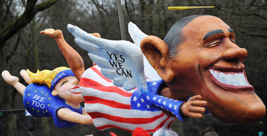 2月23日,德國民間最大的狂歡節之一科隆的“玫瑰星期一”游行舉行。圖為游行隊伍中的“超人奧巴馬”