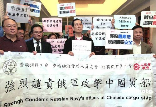 二月二十四日,香港船員及船務運輸業界代表前往俄羅斯駐香港領事館進行抗議,要求俄羅斯當局嚴懲肇事者,并對死傷者負責。二月十五日,由香港船公司租憑的貨輪“新星號”遭俄羅斯海軍炮擊而沉沒,造成八名船員失蹤及死亡。中新社發 張勤 攝