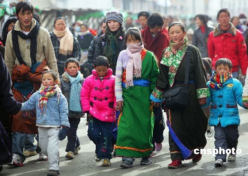 拉薩市城關(guān)區(qū)納金鄉(xiāng)嘎巴村村民穿著民族盛裝歡度藏歷新年。中新社發(fā) 廖攀 攝