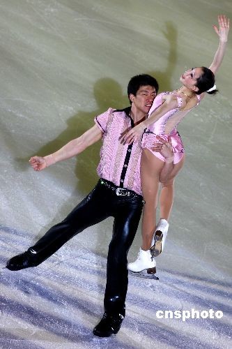 中國著名花滑組合、本屆大冬會雙人滑冠軍張丹張昊在表演中。中新社發 富田 攝