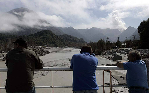 2月26日,在智利首都圣地亞哥以南1200多公里的柴滕市,當地居民觀看噴發煙霧的柴滕火山。佩德羅·門多薩 攝