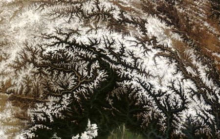 青藏高原冬季衛(wèi)星圖:NASA土地衛(wèi)星上高清代分光成象儀(MODIS)拍攝到了青藏高原的真彩圖片,可以看到被稱為"世界屋脊"的高原上,山頂?shù)狞c(diǎn)點(diǎn)積雪和部分結(jié)冰的湖面。