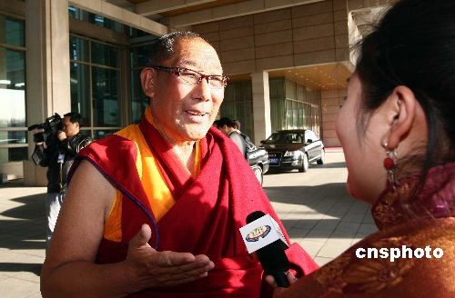 3月1日,來自西藏自治區的全國政協委員旦白尼瑪抵達北京首都機場后接受記者采訪。2OO9年全國“兩會”即將開幕,代表、委員們已開始陸續抵京報到。中新社發 杜洋 攝