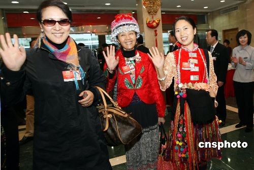 3月1日下午,參加全國政協十一屆二次會議的全國政協委員開始陸續抵京。圖為來自云南的少數民族委員在駐地受到工作人員的熱烈歡迎。中新社發 傅丹丹 攝