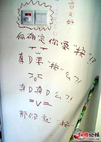 “我十分無語。”在看了女生涂鴉把宿舍惡搞之后,網友“泥巴”不解竟然還有那么多人來叫好!“在放假前夕,把學校搞成垃圾場一樣,被罰款了不說,校方得重新粉刷墻壁不說,作為大學生的自身素質也該遭受到質疑了!”