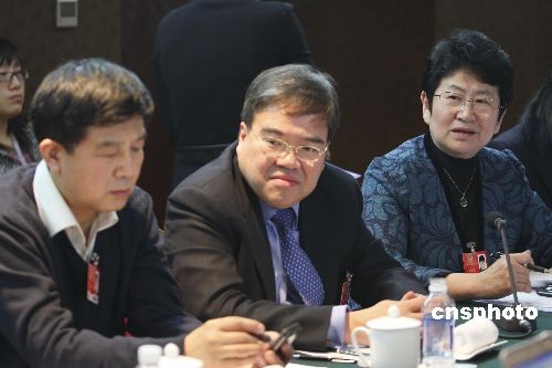 3月4日,全國政協十一屆二次會議進行分組討論,審議政協全國委員會常務委員會工作報告和提案工作情況報告。圖為全國政協委員遲寶榮(右一)在分組討論上為百萬“鄉村醫生”找出路。中新社發 盛佳鵬 攝