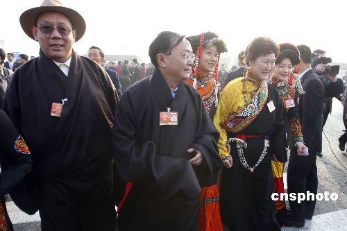 3月5日上午,十一屆全國人大二次會議在北京人民大會堂開幕。來自四川的全國人大代表甲登·洛絨向巴、李昌平等一同步入會場。中新社發 盛佳鵬 攝