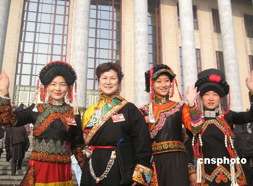 5日上午9時,十一屆全國人大二次會議在北京開幕。圖為身著民族服裝出席大會的四川女代表。中新社發 肖青 攝