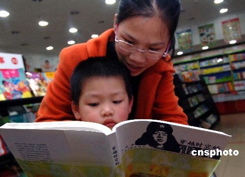 三月五日是中國“學雷鋒日”,福州一年輕母親在圖書城為兒子翻閱少兒版《穿越時空的雷鋒》一書。中新社發 劉可耕 攝