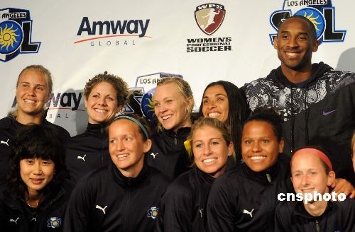 NBA著名球星科比·布萊恩特在洛杉磯歡迎加盟洛杉磯太陽隊(duì)(美國女子足球職業(yè)聯(lián)盟球隊(duì))的巴西球星瑪塔(后排右二)、中國球員韓端(前左一)等外籍球員,并與太陽隊(duì)隊(duì)員合影。中新社發(fā) 張煒 攝