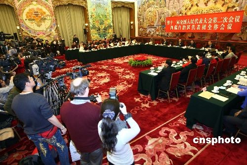 3月6日,十一屆全國人大二次會議西藏自治區代表團在人民大會堂舉行全體會議,吸引眾多中外媒體的記者。中新社發 杜洋 攝