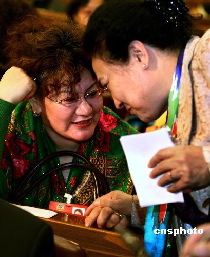 3月7日下午,全國政協(xié)十一屆二次會議舉行第二次全體會議,提前到會的兩位少數(shù)民族委員說起“私房話”。中新社發(fā) 宋吉河 攝