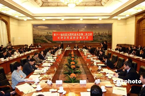 3月9日,全國人大天津代表團在人民大會堂舉行全團會議,審議全國人大常委會委員長吳邦國全國人大常委會工作報告,并向記者開放。中新社發 杜洋 攝