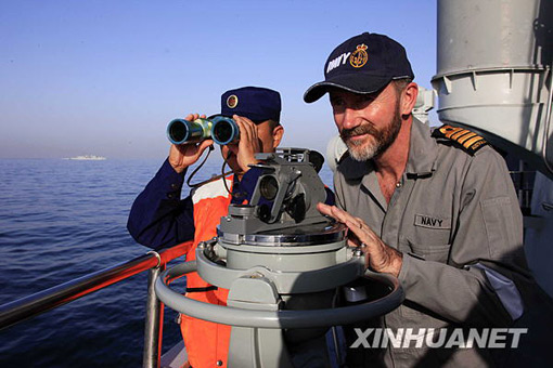 3月9日,在巴基斯坦南部卡拉奇港附近的阿拉伯海舉行的“和平-09”海上多國聯合軍事演習實兵演練中,澳大利亞海軍觀察員(右)在中國海軍“廣州”號驅逐艦上觀摩演習。查春明 攝