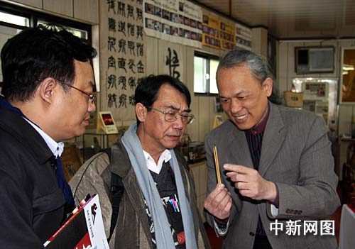 3月14日,由臺北縣政府文化局委托的專家組在“臺北縣博物館家族”之一的陳逢顯毫芒雕刻博物館內調研。圖為臺灣著名微雕家陳逢顯(右一)向專家組成員展示微雕創作用的特殊工具。作者:陳立宇
