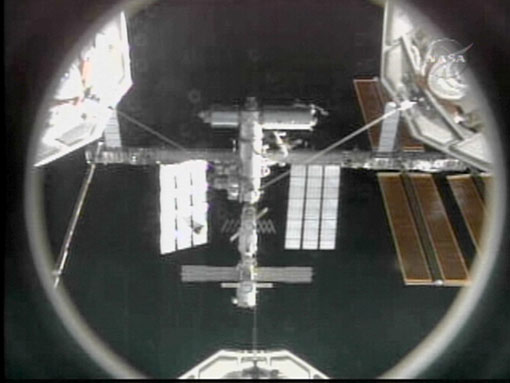 圖為美國(guó)國(guó)家航空和航天局發(fā)布的“發(fā)現(xiàn)”號(hào)與國(guó)際空間站對(duì)接電視截圖。