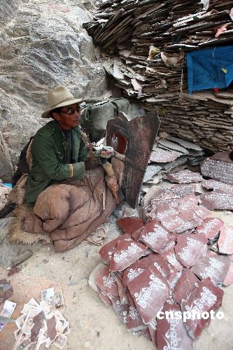 3月18日,拉薩藥王山下的刻經人虔誠的在石板上篆刻經文。中新社發 杜洋 攝