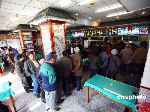 3月20日,迎來24節氣中的“春分”,意思是說春天過了一半。按照老北京的習俗,“春分吃豆面糕(驢打滾),避邪祈福”。北京著名護國寺小吃連鎖店為這天的到來準備了1萬多個驢打滾。圖為在護國寺小吃店了排隊買驢打滾的民眾。中新社發 富田 攝