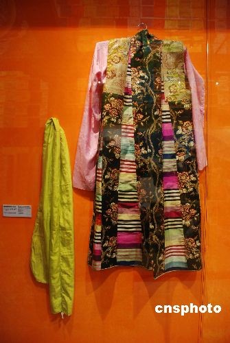 為期五天的“雪域風(fēng)情——藏族非物質(zhì)文化遺產(chǎn)精粹展”三月二十日下午在澳門綜藝館開幕,在西藏服飾展區(qū)展出了一件十四世達(dá)賴一九五二年贈(zèng)送中央人民政府的藏式織錦女袍。中新社發(fā) 畢永光 攝
