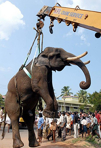 4月1日,印度喀拉拉邦一頭公象在交通繁忙的公路上被一輛卡車撞到,兩條后腿骨折和背部受傷,獸醫(yī)不得不動用起重機來搬運這個“龐然大物”。據(jù)報道,這頭大象高9英尺(約2.7米),重達6噸,剛剛從附近的一家印度教寺廟逃出。在事發(fā)現(xiàn)場,數(shù)百名觀眾正在觀看獸醫(yī)如何救治受傷的大象和如何將它搬離現(xiàn)場。一名獸醫(yī)表示,這頭大象體型龐大,情緒極不穩(wěn)定。不過,它此前一直生活在附近人來人往的寺廟,所以對人并不十分恐懼。在對大象做過全面評估后,他們決定從附近的建筑工地上征用一輛起重機,將這頭大象吊到卡車上,將它運往一家獸醫(yī)醫(yī)院。據(jù)悉,搬運工作進展得十分順利。不過,令人可悲的是,盡管獸醫(yī)在努力救治這頭大象,但由于它的傷勢過于嚴重,于當天晚間死去。
